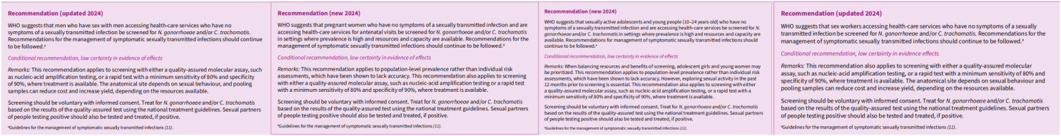 திஅறிகுறியற்ற பாலியல் ரீதியாக பரவும் நோய்த்தொற்றுகளை நிர்வகிப்பதற்கான வழிகாட்டுதல்கள்(ஜூலை 2025)[1], முறையான ஆய்வுகள் மற்றும் நிபுணர் மதிப்பீடுகளுடன் GRADE வழிமுறையைப் பயன்படுத்தி உருவாக்கப்பட்டது, குறிப்பாக N. gonorrhoeae மற்றும் C. trachomatis ஆகியவற்றைச் சோதிப்பதற்கான சான்றுகளின் அடிப்படையிலான பரிந்துரைகளில் கவனம் செலுத்துகிறது. வளங்கள் கிடைக்கும் முக்கிய மக்கள் தொகையில் இலக்கு வைக்கப்பட்ட பரிசோதனையை இந்த வழிகாட்டுதல்கள் வெளிப்படையாகப் பரிந்துரைக்கின்றன, இதில் பின்வருவன அடங்கும்:கர்ப்பிணிப் பெண்கள், பாலியல் ரீதியாகச் சுறுசுறுப்பாக இருக்கும் 10-24 வயதுக்குட்பட்ட இளம் பருவத்தினர் மற்றும் இளைஞர்கள், பாலியல் தொழிலாளர்கள், மற்றும் ஆண்களுடன் பாலியல் உறவு கொள்ளும் ஆண்கள் (MSM)பரிசோதனை அதிர்வெண் பரிந்துரைகள் குறிப்பிடுகின்றனபாலியல் தொழிலாளர்கள் மற்றும் ஆண்களுடன் பாலியல் உறவு கொள்ளும் ஆண்களுக்குக் குறைந்தபட்சம் ஆண்டுதோறும் அல்லது ஆறு மாதங்களுக்கு ஒருமுறை பரிசோதனை.சாத்தியமான இடங்களில்.