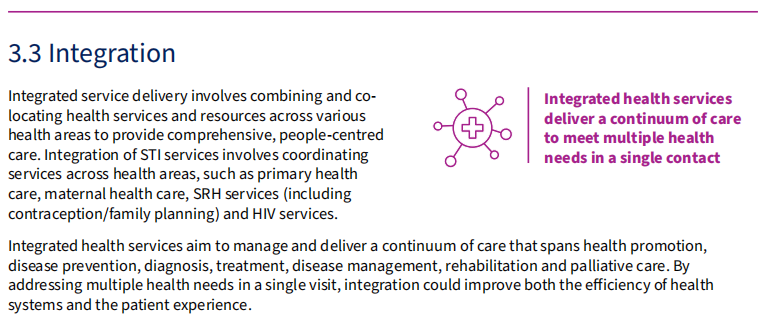 பாலியல் நோய்த்தொற்றுகள் மீதான WHO ஒருங்கிணைந்த செயல்பாட்டுக் கையேடு (பிப்ரவரி 2026)[3], முதன்மைப் பராமரிப்பு, சமூகம், எச்.ஐ.வி, இனப்பெருக்க ஆரோக்கியம் மற்றும் தாய்-குழந்தை சுகாதார தளங்கள் முழுவதும் பாலியல் நோய்த்தொற்று சேவைகளை ஒருங்கிணைப்பதற்கான ஒரு செயல்பாட்டு கட்டமைப்பை வழங்குகிறது. கண்டறியும் உத்திக்காக, மூன்று முக்கிய ஆணைகள் வெளிப்படுகின்றன: